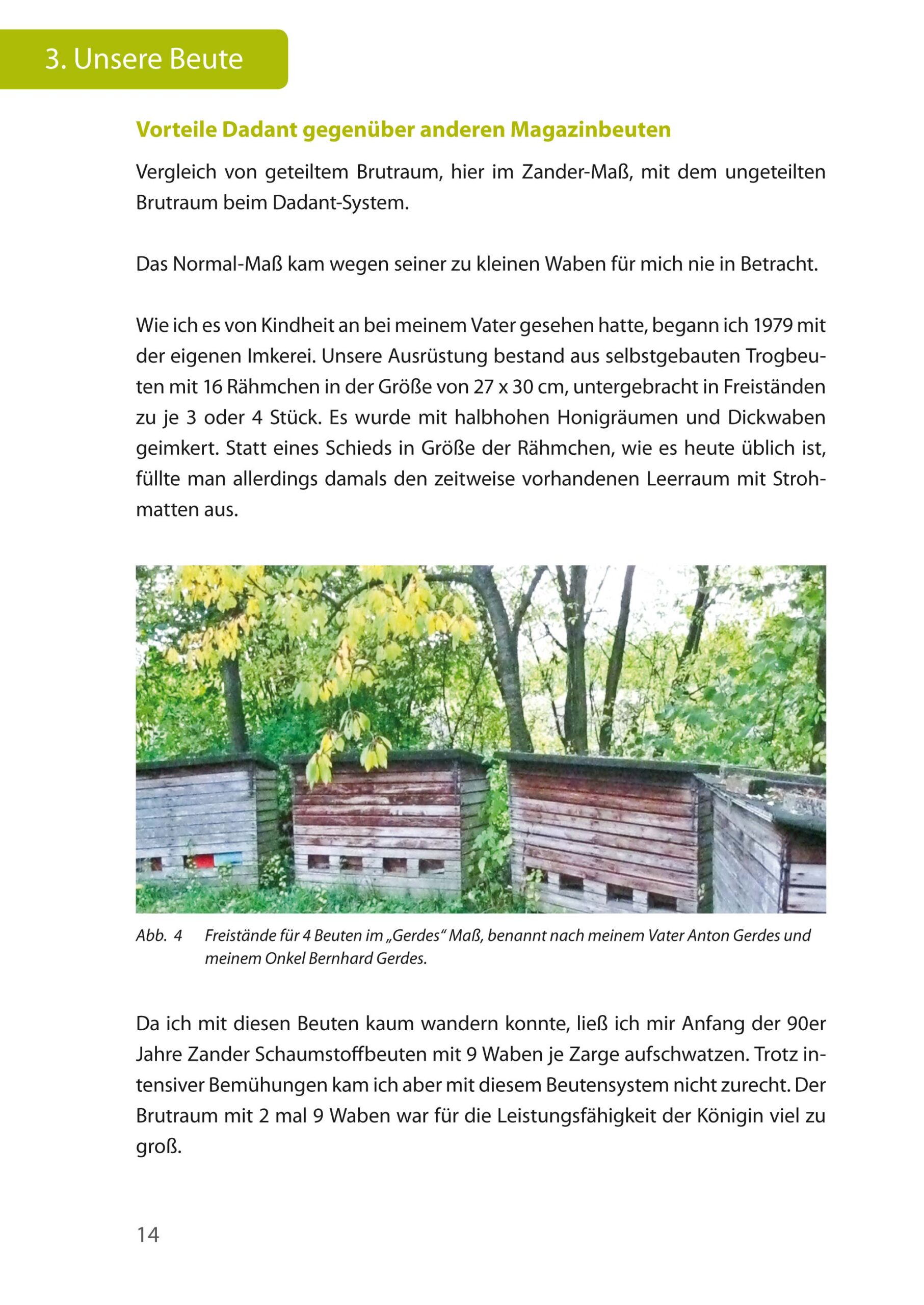 Üblicherweise wurde die damals allgemein bevorzugte Carnica Biene in Trogbeuten gehalten.