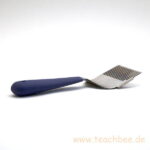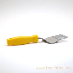 Die gelaserte Entdecklungsgabel kommt mit einem seitlichem Rähmchenkratzer und einem Kunststoffgriff.